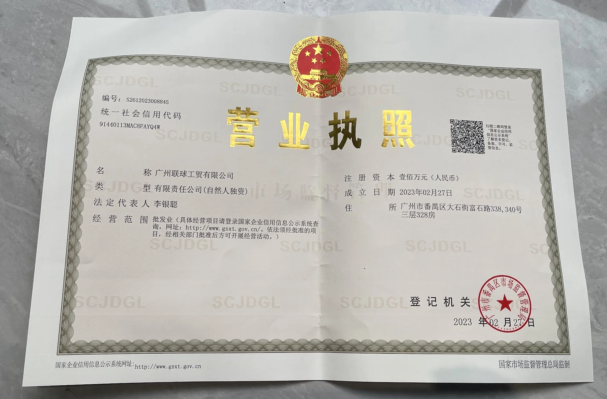 Registered address : Room 328, 3rd Floor, No. 338, 340, Fushi Road, Dashi Street Guangzhou Guangdong China